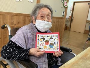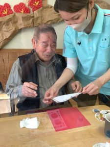 また、恵方巻の具材の話題にもなり、Kさんの家では、『にんじん、ゴボウ、かんぴょう、ちくわ、桜でんぶ』Yさんの家では『卵、かんぴょう、きゅうり、桜でんぶ、にんじん、かまぼこ、高野豆腐、つわ』など、それぞれの家庭の味の話に。職員の方が興味あり「それ美味しそうやね~😍」「今度入れてみようかしら。」など話が盛り上がりました。